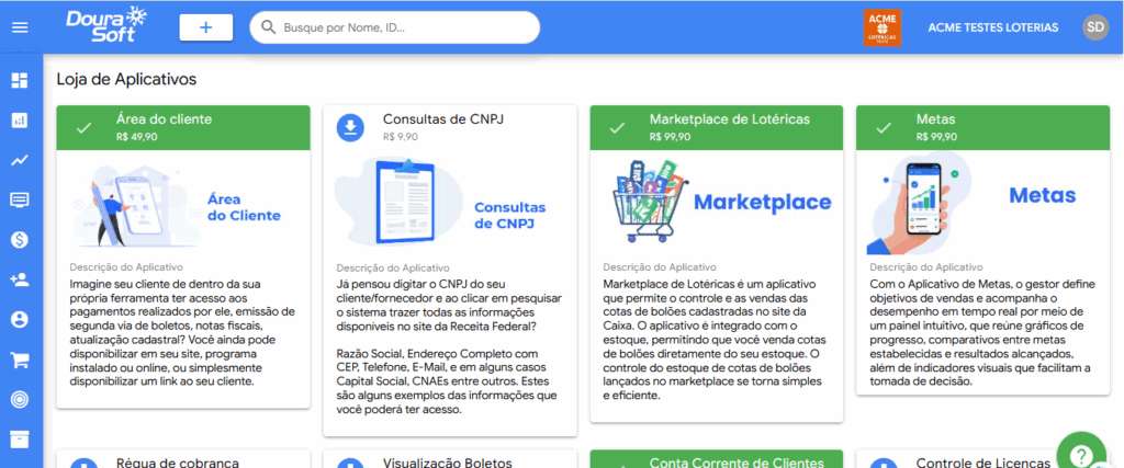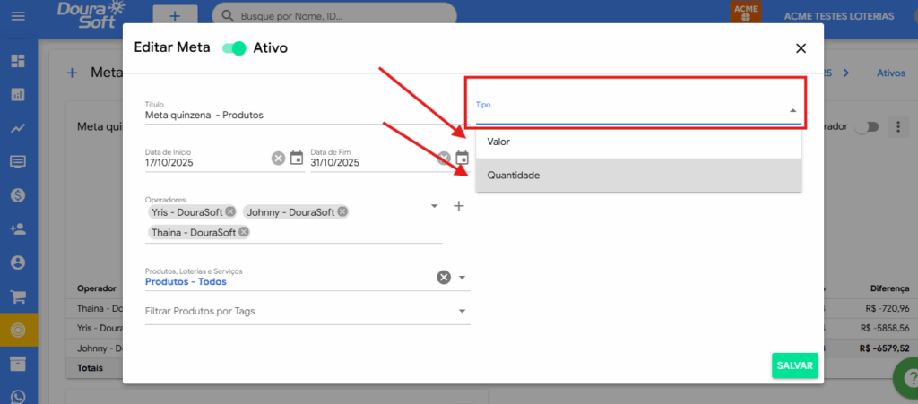 5. Selecione os produtos, serviços ou loterias que farão parte da meta.
