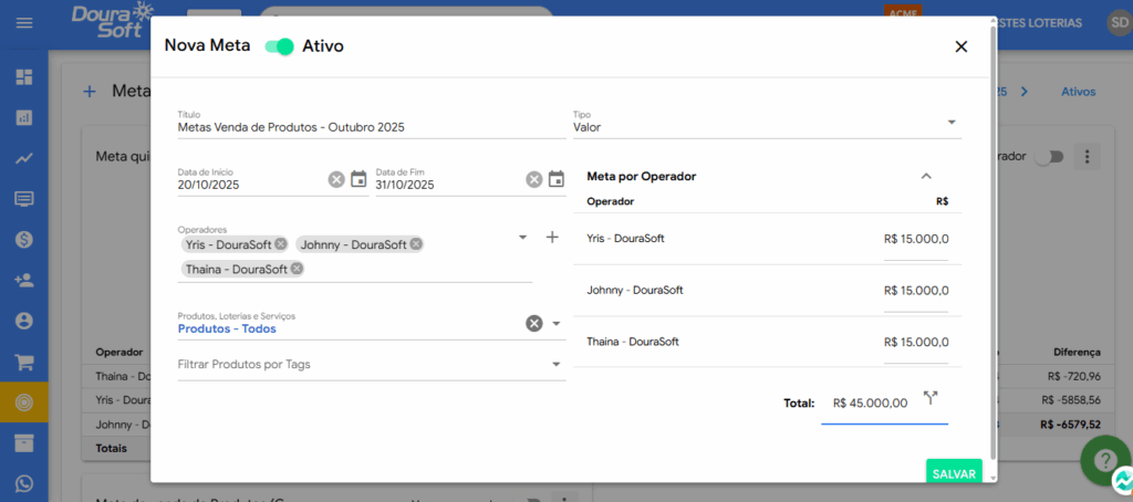 O total exibido no dashboard representa a soma das metas individuais dos operadores.