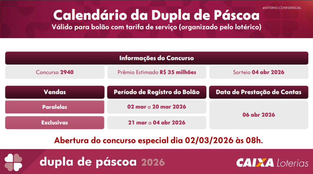 A partir do dia 02/03/2026, iniciam as vendas paralelas da Dupla de Páscoa, com prêmio estimado em R$ 35 milhões, que não acumula. O sorteio do concurso especial 2940 da Dupla Sena será realizado no dia 04 de Abril. As vendas exclusivas para a Dupla de Páscoa iniciam no dia 21 de Março.